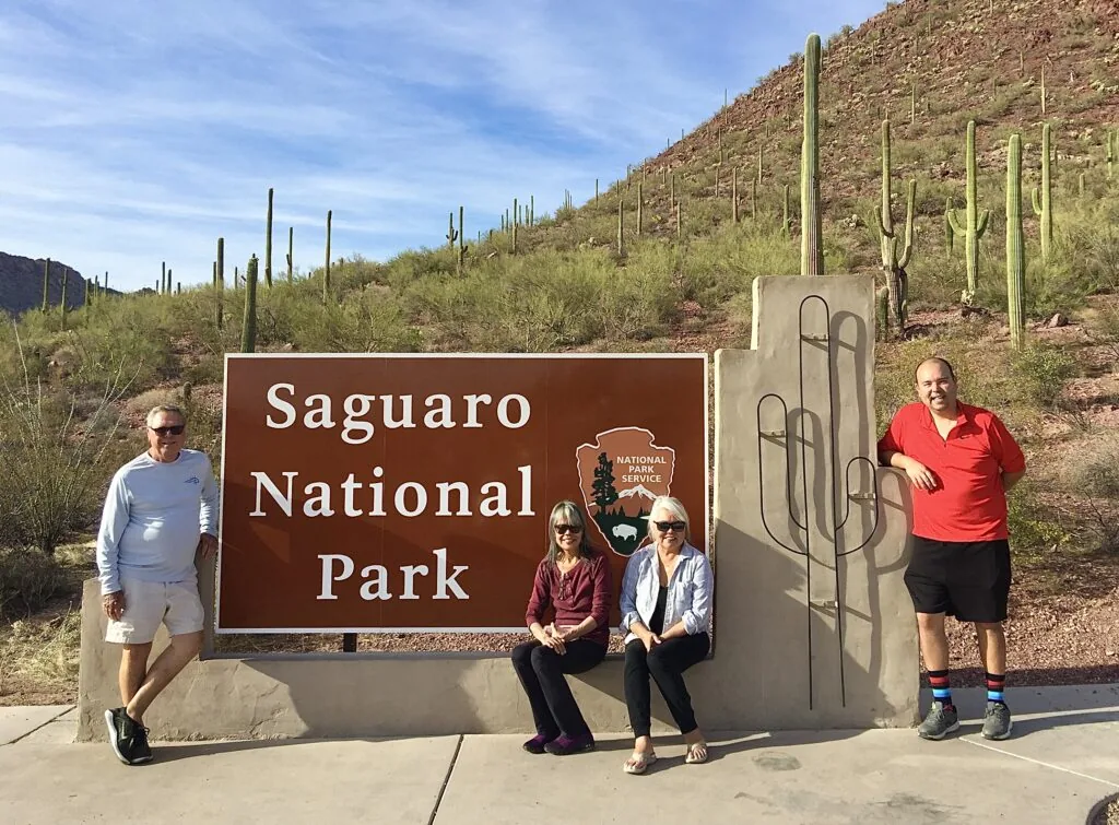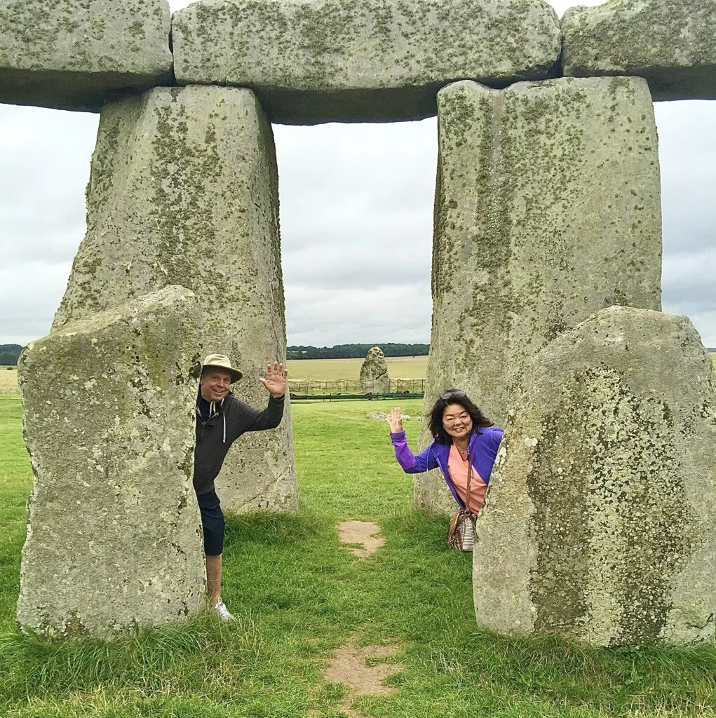 Above: Lynne posed with Joe, son Jonas, & her sister Brenda by the visitor center at Saguaro National Park during their Southwest adventure last spring. Below: In England visiting Stonehenge