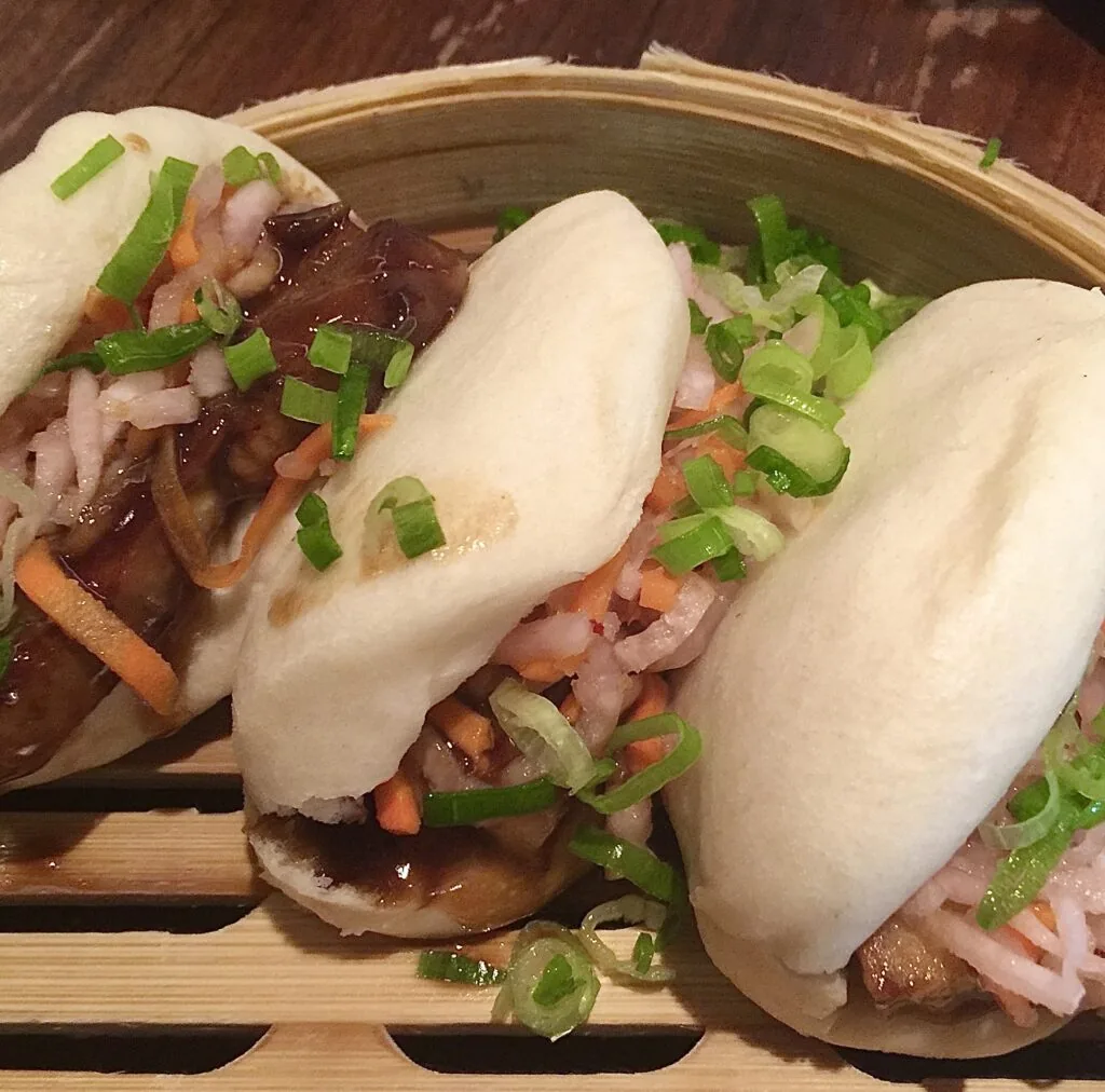 Above: While in Hawaii Lynne orders pork belly buns, another popular dish on the islands; the buns are steamed & garnished with pickled radishes & green onions.