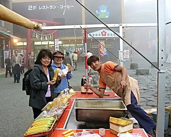 Lynne & her mom Sumiko stopped for a tasty sightseeing snack of roasted corn near Mt. Fuji.