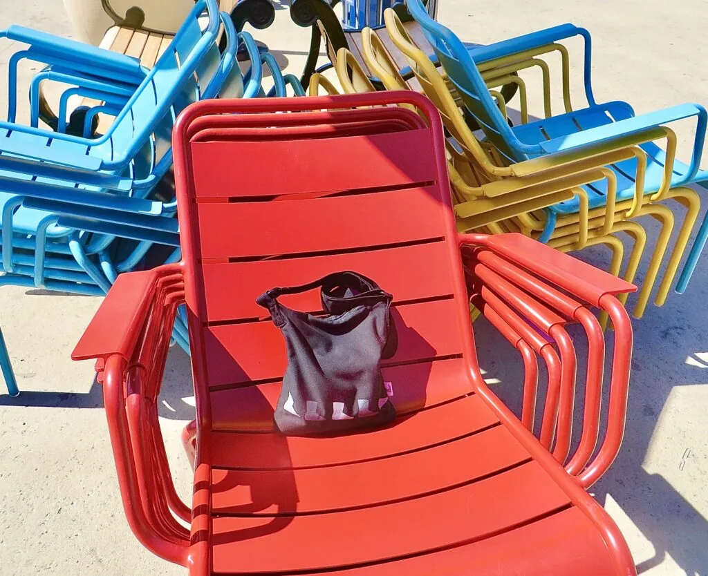 Colorful chairs are ready to use at Balboa Park’s Plaza de Panama. This area once had been a parking lot but now is a big open space similar to plazas found in European cities. Tables with umbrellas were added for the park’s 100th anniversary in 2015, and the plaza has become a popular spot to sit and enjoy the surroundings.