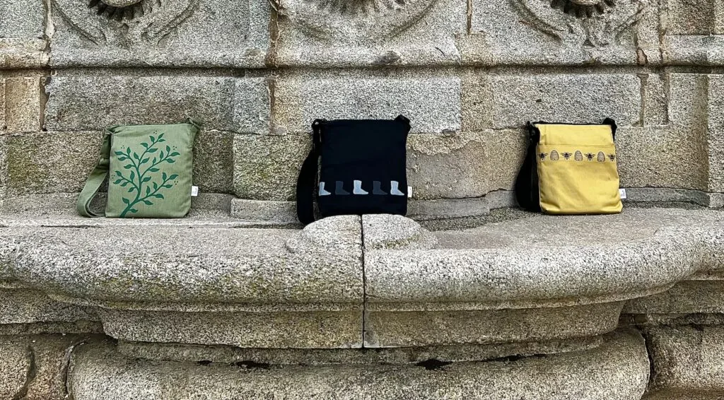 The Gold Bee Bag poses by a rustic gate near Fontoura.
