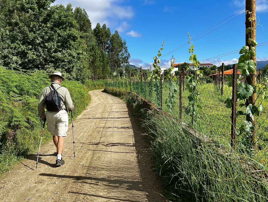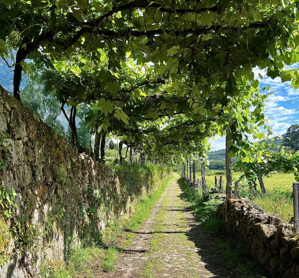 From Ponte de Lima the path continued on Day 9 through cobblestoned towns, tree groves, & mountain backdrops. Many homes were bordered by grapevine fences next to gardens that grew summer produce in abundance.
