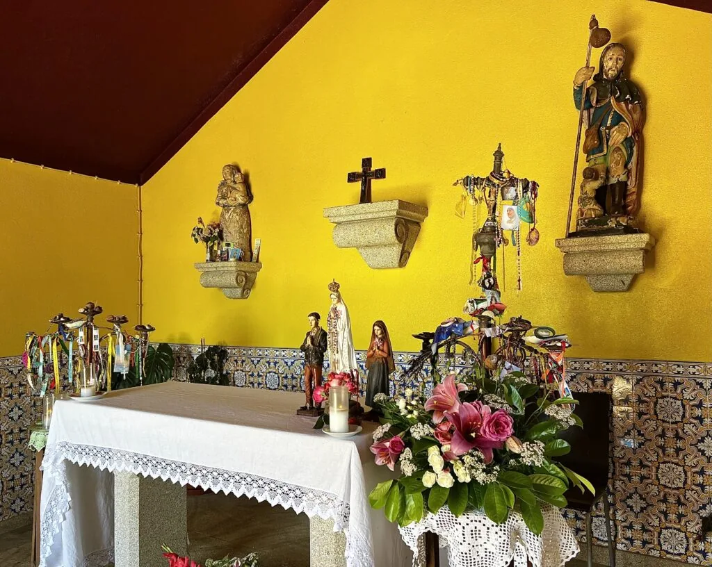 Adjacent to Cafe Nunes was Capela de Nossa Senhora das Neves with a bright yellow interior & a figure of St. James. The saint carried a walking stick, gourd, & of course, a “pilgrim pouch.”