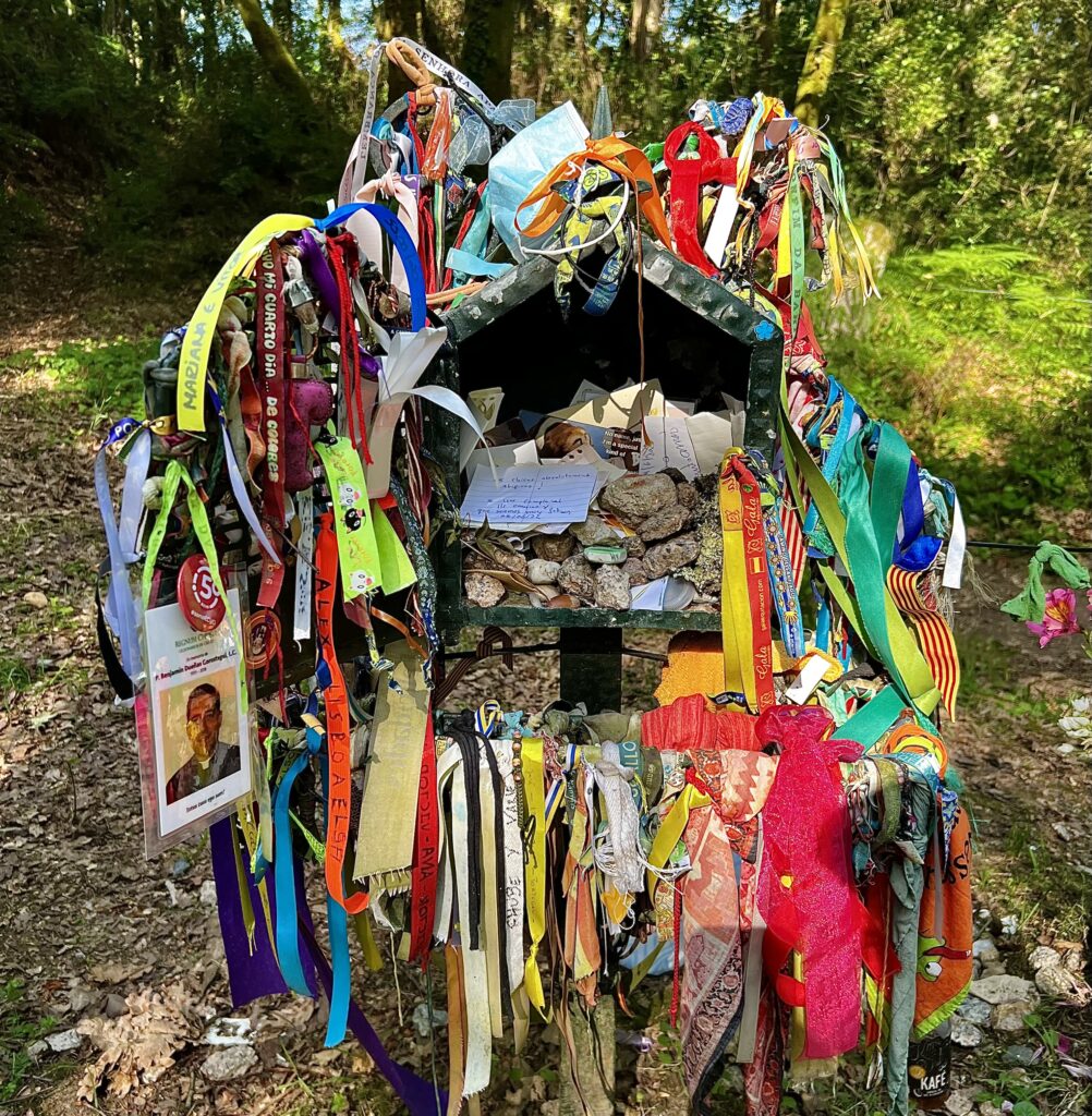 An ‘intention’ site on Day 13 from Tui to O Porrino featured ribbons, photos, rocks, & mementos.