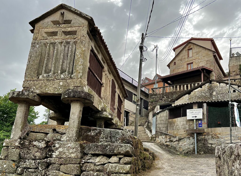 The Gold Bee Bag takes a break at a large horreo in Soutomaior beyond Redondela on Day 15.