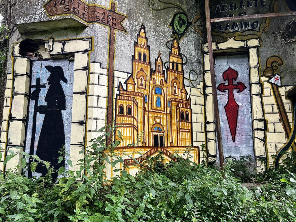 A mural of Santiago’s Cathedral was painted along a roadway near Pontevedra.