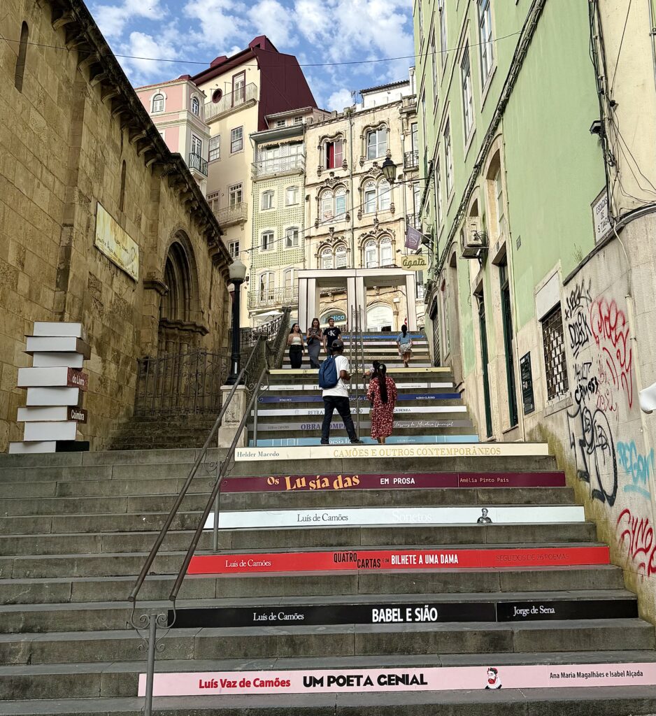 In conjunction with a book fair happening there were stacks of oversized books and book spines highlighted on a staircase.
