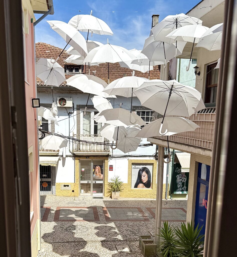 Art inspired by Roy Lichtenstein covered a store window in Agueda, a charming town with a public art installation called “Umbrella Sky Project” that features hanging umbrellas.