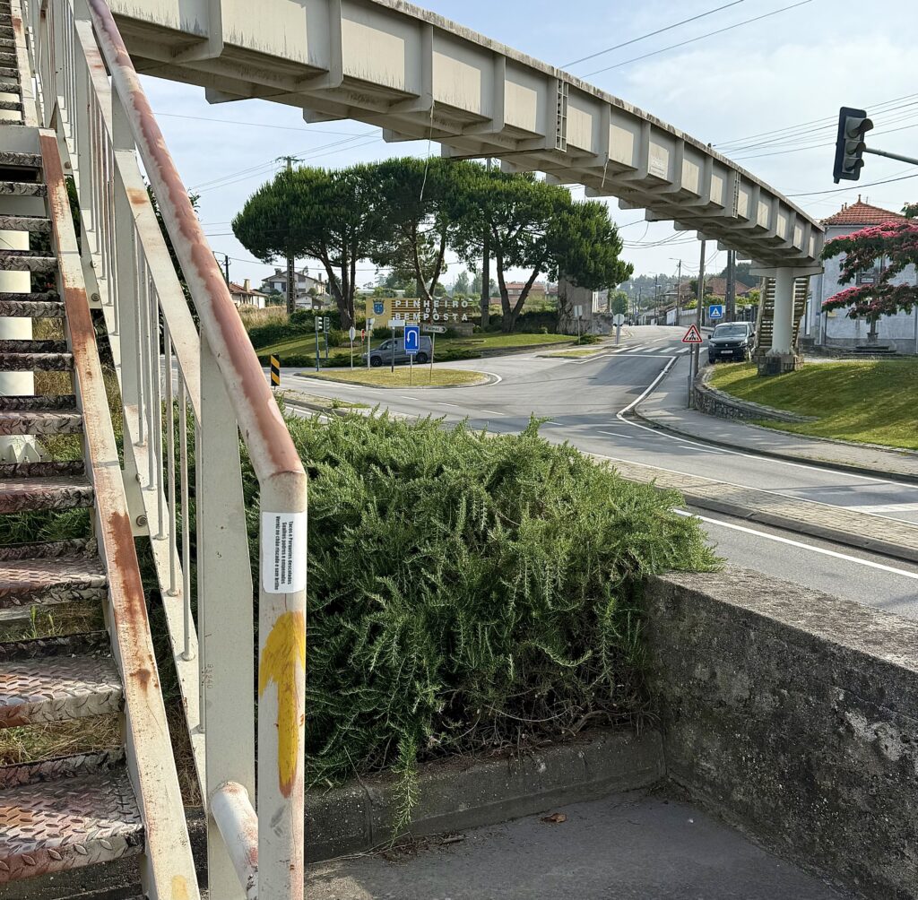 The yellow arrow pointed up and over a walkway in Pinheiro da Bemposta.