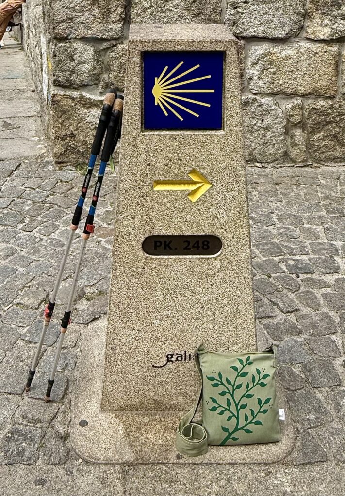 In June 2022 I took a photo of Dad by the marker before we began from Porto. This year the Green Foliage Bag was with me to celebrate the finish at the Cathedral.