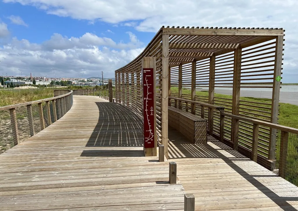 Near Bobadela there’s a recently completed 6.1 kilometer (3.8 miles) boardwalk (Percurso Ribeirinho de Loures) that spans the Tejo Estuary. The wood surface provided more ‘cushion’ than walking on roads but had few ‘exits’ off the boardwalk for a ‘bathroom’ break. It’s a scenic option, though, and a bit shorter than following the ‘old’ path that circles inland from the water (check out guides/apps for info about this option).