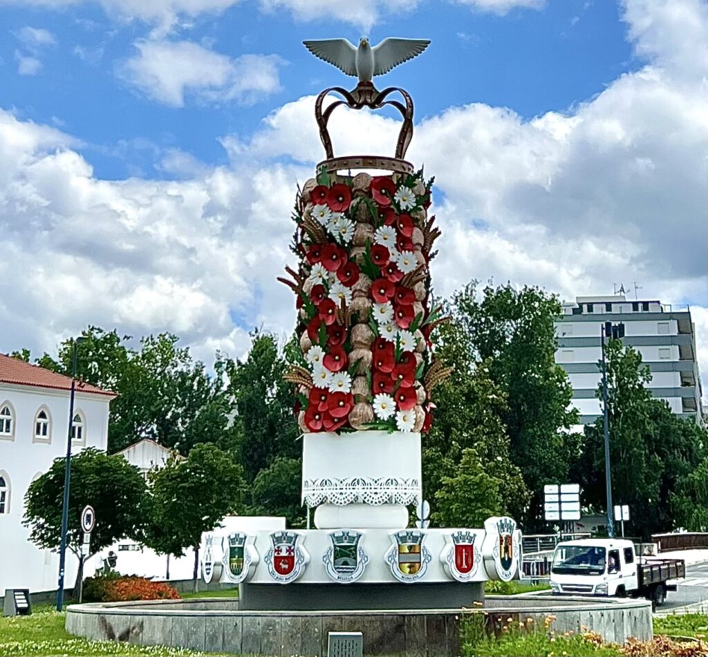 In the center a fountain sculpture represented the bread & flower “tray” headdress worn during the Festa dos Tabuleiros (Festival of the Trays). The towering headdress is composed of bread, flowers, and a crown & dove. The religious festival happens every 4 years and is rooted in ancient harvest celebrations.