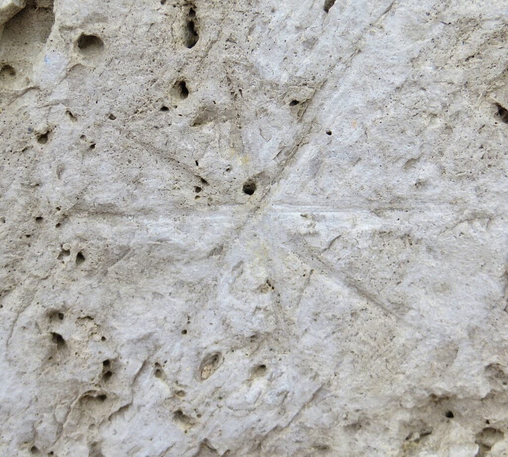 Most medieval pilgrims, however, likely navigated by following the stars (estrellas) of the Milky Way. This galaxy lies above the Road; thus, the Camino is sometimes referred to as “Following the Milky Way” — there’s even a saying that the Milky Way was formed by “the dust of pilgrims’ feet.” Also, star markings were inscribed onto buildings to help with guidance. The photo shows a star carved onto the stone walls of 13th c. Ermita de San Nicolas near Itero de la Vega, a town on Camino Frances. The mark confirmed to walkers that the chapel was indeed located on the route.